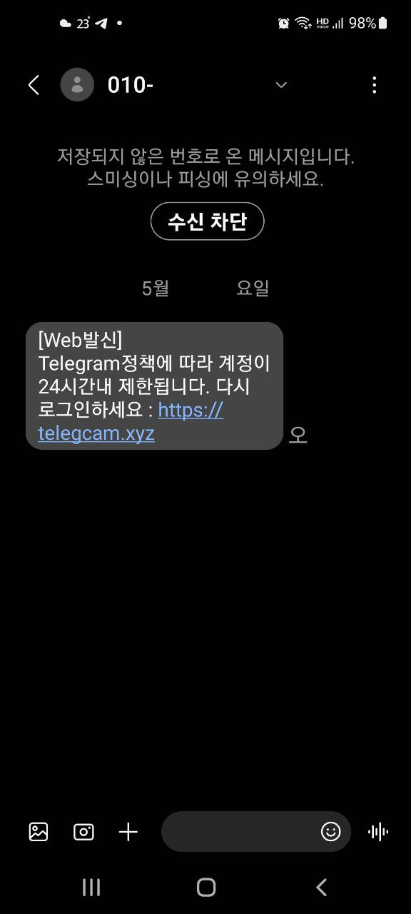 휴대폰 메시지 SMS에 있는 주소는 함부로 누르면 계정 탈취당할 수 있다.